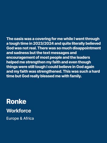 God has honestly blessed me through Oasis with the gift of people. I had been praying for a space where I could truly belong and grow with like-minded believers, and Oasis became that for me. Literally an answered prayer!